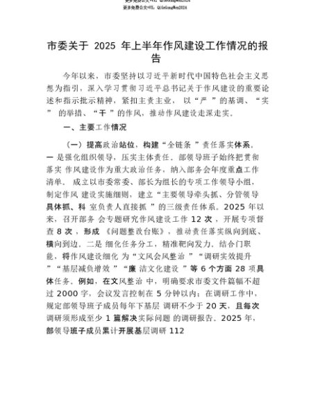 【七哥公文】2025年:【七哥公文】市委关于2025年上半年作风建设工作情况的报告+更多免费公文+VX:QiGeGongWen2024+更多免费公文+VX:QiGeGongWen2024