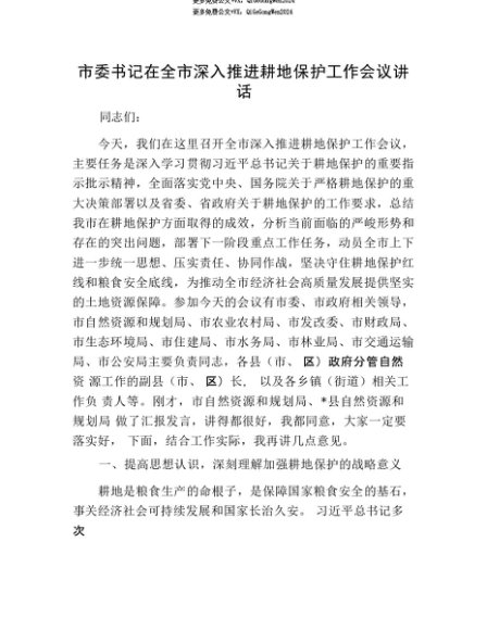 【七哥公文】2025年:【七哥公文】市委书记在全市深入推进耕地保护工作会议讲话+更多免费公文+VX:QiGeGongWen2024+更多免费公文+VX:QiGeGongWen2024