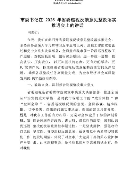 【七哥公文】2025年:【七哥公文】市委书记在2025年省委巡视反馈意见整改落实推进会上的讲话+更多免费公文+VX:QiGeGongWen2024+更多免费公文+VX:QiGeGongWen2024