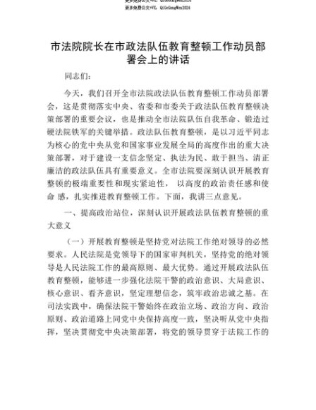 【七哥公文】2025年:【七哥公文】市法院院长在市政法队伍教育整顿工作动员部署会上的讲话+更多免费公文+VX:QiGeGongWen2024+更多免费公文+VX:QiGeGongWen2024