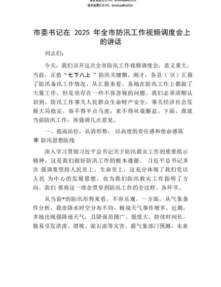 【七哥公文】2025年:【七哥公文】市委书记在2025年全市防汛工作视频调度会上的讲话+更多免费公文+VX:QiGeGongWen2024+更多免费公文+VX:QiGeGongWen2024