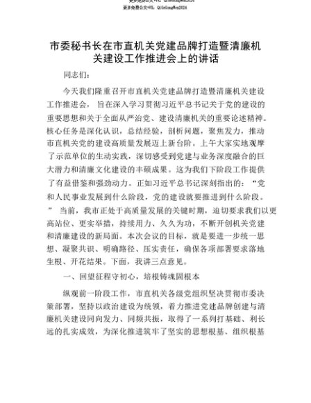 【七哥公文】2025年:【七哥公文】市委秘书长在市直机关X建品牌打造暨清廉机关建设工作推进会上的讲话+更多免费公文+VX:QiGeGongWen2024+更多免费公文+VX:QiGeGongWen2024
