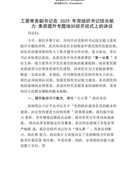 【七哥公文】2025年:【七哥公文】工委常务副书记在2025年X组织书记综合能力素质提升专题培训班开班式上的讲话+更多免费公文+VX:QiGeGongWen2024+更多免费公文+VX:QiGeGongWen2024
