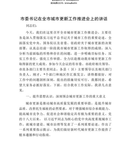 【七哥公文】2025年:【七哥公文】市委书记在全市城市更新工作推进会上的讲话+更多免费公文+VX:QiGeGongWen2024+更多免费公文+VX:QiGeGongWen2024