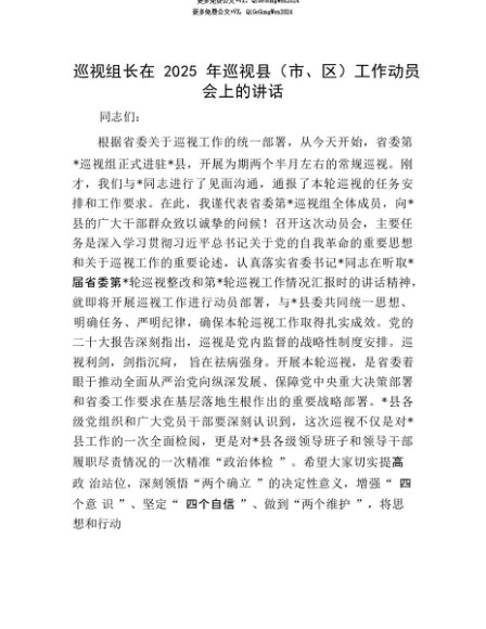 【七哥公文】2025年:【七哥公文】巡视组长在2025年巡视县(市、区)工作动员会上的讲话+更多免费公文+VX:QiGeGongWen2024+更多免费公文+VX:QiGeGongWen2024