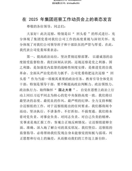 【七哥公文】2025年:【七哥公文】在2025年集团巡察工作动员会上的表态发言+更多免费公文+VX:QiGeGongWen2024+更多免费公文+VX:QiGeGongWen2024