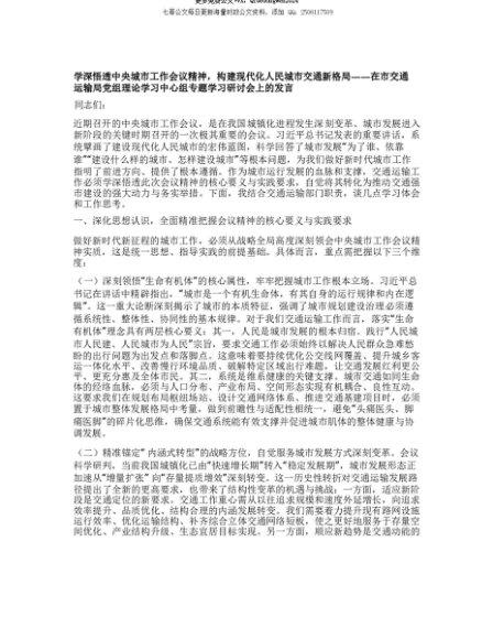 【七哥公文】2025年:【七哥公文】学深悟透中央城市工作会议精神,构建现代化人民城市交通新格局——在市交通运输局X组理论学习中心组专题学习研讨会上的发言+更多免费公文+VX:QiGeGongWen2024+更多免费公文+VX:QiGeGongWen2024