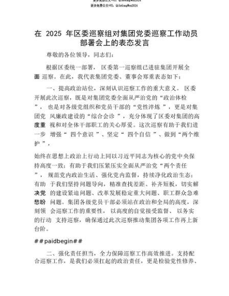 【七哥公文】2025年:【七哥公文】在2025年区委巡察组对集团X委巡察工作动员部署会上的表态发言+更多免费公文+VX:QiGeGongWen2024+更多免费公文+VX:QiGeGongWen2024