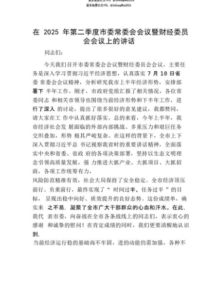 【七哥公文】2025年:【七哥公文】在2025年第二季度市委常委会会议暨财经委员会会议上的讲话+更多免费公文+VX:QiGeGongWen2024+更多免费公文+VX:QiGeGongWen2024