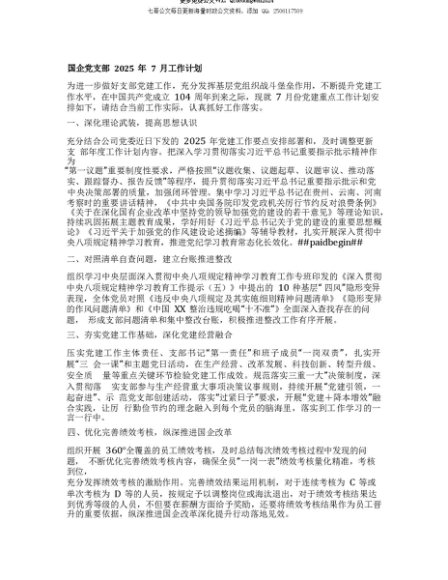 【七哥公文】2025年:【七哥公文】国企X支部2025年7月工作计划+更多免费公文+VX:QiGeGongWen2024+更多免费公文+VX:QiGeGongWen2024