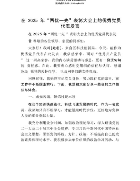 【七哥公文】2025年:【七哥公文】在2025年“两优一先”表彰大会上的优秀X员代表发言+更多免费公文+VX:QiGeGongWen2024+更多免费公文+VX:QiGeGongWen2024