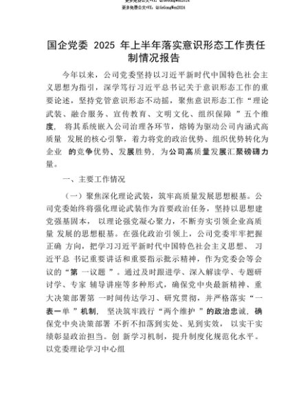【七哥公文】2025年:【七哥公文】国企X委2025年上半年落实意识形态工作责任制情况报告+更多免费公文+VX:QiGeGongWen2024+更多免费公文+VX:QiGeGongWen2024