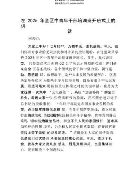 【七哥公文】2025年:【七哥公文】在2025年全区中青年干部培训班开班式上的讲话+更多免费公文+VX:QiGeGongWen2024+更多免费公文+VX:QiGeGongWen2024