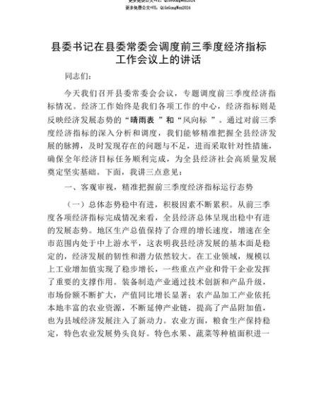 【七哥公文】2025年:【七哥公文】县委书记在县委常委会调度前三季度经济指标工作会议上的讲话+更多免费公文+VX:QiGeGongWen2024+更多免费公文+VX:QiGeGongWen2024