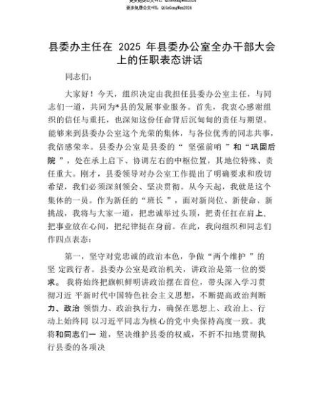 【七哥公文】2025年:【七哥公文】县委办主任在2025年县委办公室全办干部大会上的任职表态讲话+更多免费公文+VX:QiGeGongWen2024+更多免费公文+VX:QiGeGongWen2024