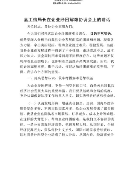 【七哥公文】2025年:【七哥公文】县工信局长在企业纾困解难协调会上的讲话+更多免费公文+VX:QiGeGongWen2024+更多免费公文+VX:QiGeGongWen2024