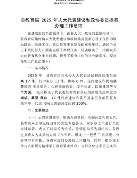 【七哥公文】2025年:【七哥公文】县教育局2025年人大代表建议和政协委员提案办理工作总结+更多免费公文+VX:QiGeGongWen2024+更多免费公文+VX:QiGeGongWen2024
