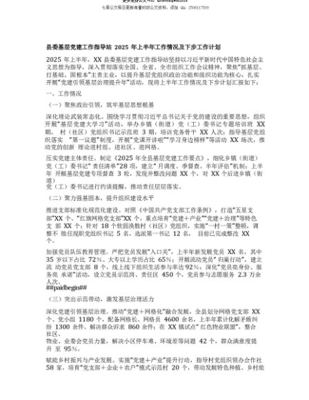 【七哥公文】2025年:【七哥公文】县委基层X建工作指导站2025年上半年工作情况及下步工作计划+更多免费公文+VX:QiGeGongWen2024+更多免费公文+VX:QiGeGongWen2024