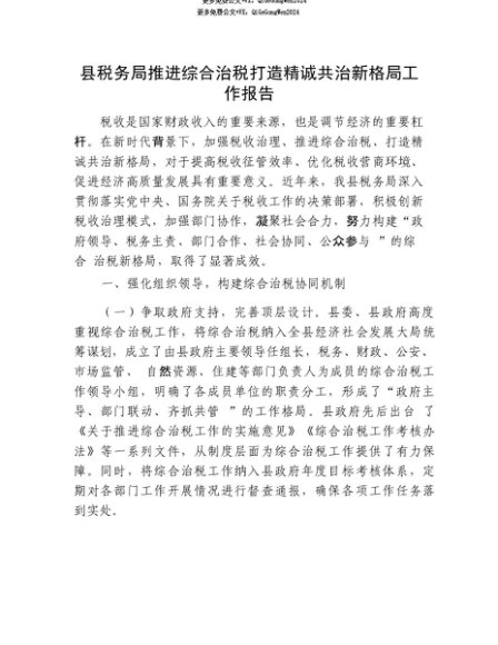 【七哥公文】2025年:【七哥公文】县税务局推进综合治税打造精诚共治新格局工作报告+更多免费公文+VX:QiGeGongWen2024+更多免费公文+VX:QiGeGongWen2024