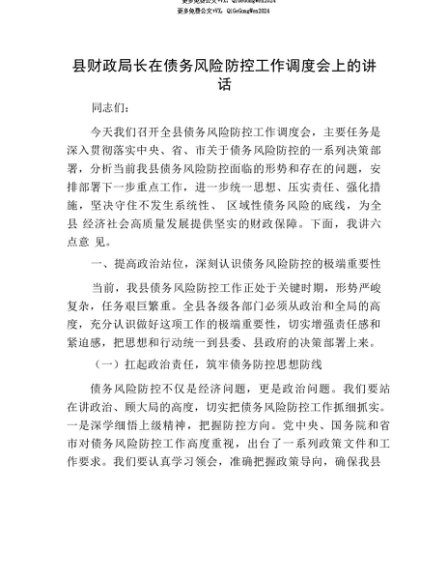 【七哥公文】2025年:【七哥公文】县财政局长在债务风险防控工作调度会上的讲话+更多免费公文+VX:QiGeGongWen2024+更多免费公文+VX:QiGeGongWen2024