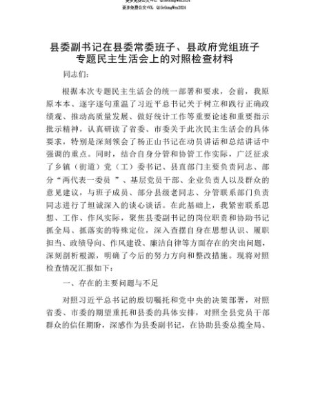 【七哥公文】2025年:【七哥公文】县委副书记在县委常委班子、县政府X组班子专题民主生活会上的对照检查材料+更多免费公文+VX:QiGeGongWen2024+更多免费公文+VX:QiGeGongWen2024