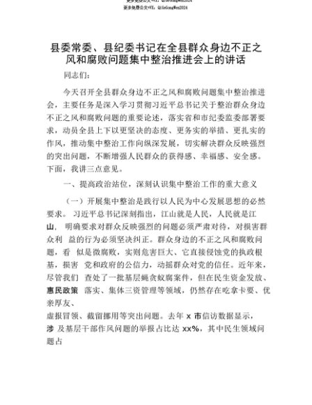 【七哥公文】2025年:【七哥公文】县委常委、县纪委书记在全县群众身边不正之风和腐败问题集中整治推进会上的讲话+更多免费公文+VX:QiGeGongWen2024+更多免费公文+VX:QiGeGongWen2024
