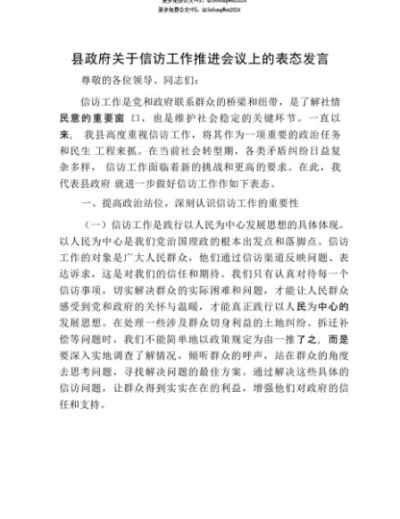 【七哥公文】2025年:【七哥公文】县政府关于信访工作推进会议上的表态发言+更多免费公文+VX:QiGeGongWen2024+更多免费公文+VX:QiGeGongWen2024