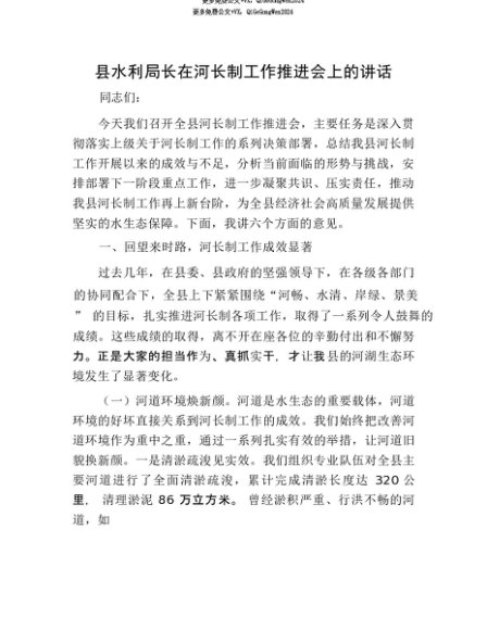 【七哥公文】2025年:【七哥公文】县水利局长在河长制工作推进会上的讲话+更多免费公文+VX:QiGeGongWen2024+更多免费公文+VX:QiGeGongWen2024
