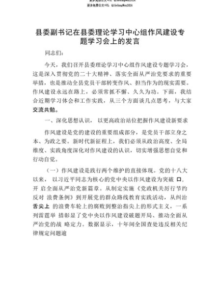 【七哥公文】2025年:【七哥公文】县委副书记在县委理论学习中心组作风建设专题学习会上的发言+更多免费公文+VX:QiGeGongWen2024+更多免费公文+VX:QiGeGongWen2024