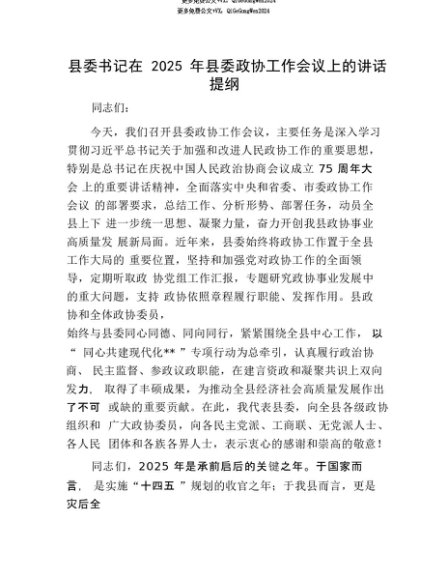 【七哥公文】2025年:【七哥公文】县委书记在2025年县委政协工作会议上的讲话提纲+更多免费公文+VX:QiGeGongWen2024+更多免费公文+VX:QiGeGongWen2024