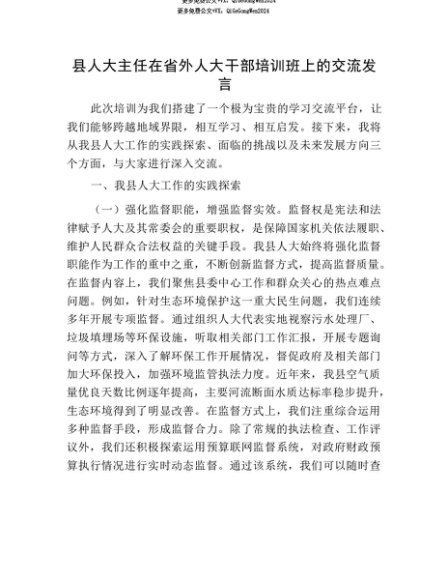 【七哥公文】2025年:【七哥公文】县人大主任在省外人大干部培训班上的交流发言+更多免费公文+VX:QiGeGongWen2024+更多免费公文+VX:QiGeGongWen2024