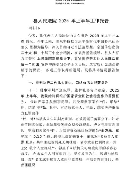 【七哥公文】2025年:【七哥公文】县人民法院2025年上半年工作报告+更多免费公文+VX:QiGeGongWen2024+更多免费公文+VX:QiGeGongWen2024