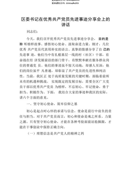 【七哥公文】2025年:【七哥公文】区委书记在优秀共产X员先进事迹分享会上的讲话+更多免费公文+VX:QiGeGongWen2024+更多免费公文+VX:QiGeGongWen2024