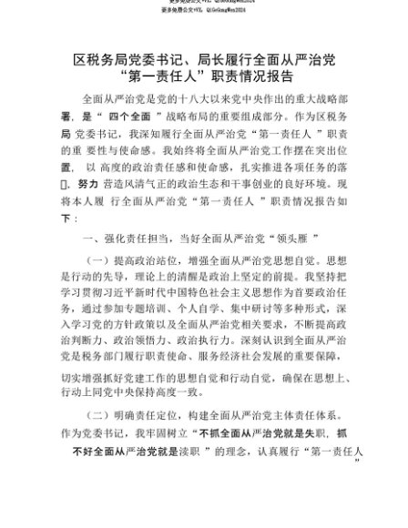 【七哥公文】2025年:【七哥公文】区税务局X委书记、局长履行全面从严治X“第一责任人”职责情况报告+更多免费公文+VX:QiGeGongWen2024+更多免费公文+VX:QiGeGongWen2024