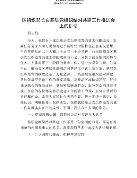 【七哥公文】2025年:【七哥公文】区组织部长在基层X组织结对共建工作推进会上的讲话+更多免费公文+VX:QiGeGongWen2024+更多免费公文+VX:QiGeGongWen2024