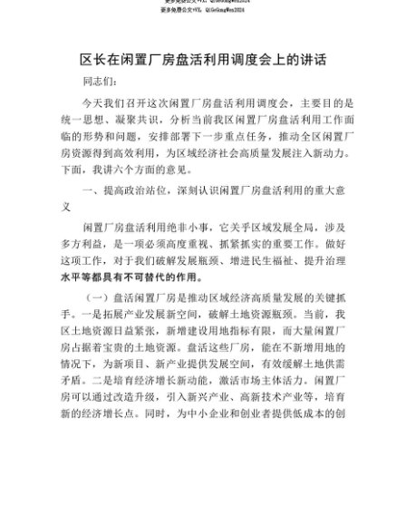 【七哥公文】2025年:【七哥公文】区长在闲置厂房盘活利用调度会上的讲话+更多免费公文+VX:QiGeGongWen2024+更多免费公文+VX:QiGeGongWen2024