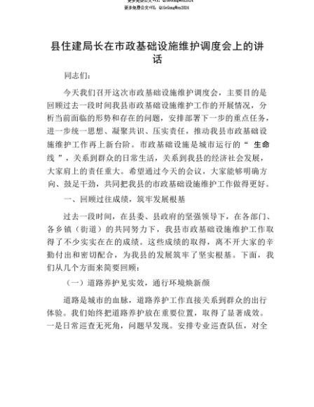 【七哥公文】2025年:【七哥公文】县住建局长在市政基础设施维护调度会上的讲话+更多免费公文+VX:QiGeGongWen2024+更多免费公文+VX:QiGeGongWen2024
