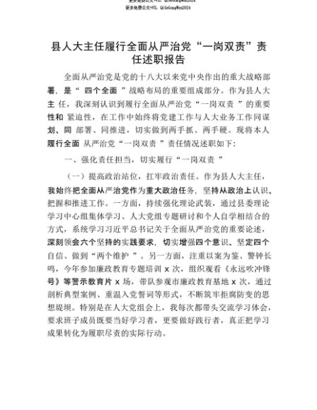 【七哥公文】2025年:【七哥公文】县人大主任履行全面从严治X“一岗双责”责任述职报告+更多免费公文+VX:QiGeGongWen2024+更多免费公文+VX:QiGeGongWen2024