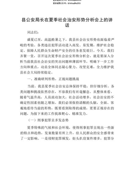 【七哥公文】2025年:【七哥公文】县公安局长在夏季社会治安形势分析会上的讲话+更多免费公文+VX:QiGeGongWen2024+更多免费公文+VX:QiGeGongWen2024