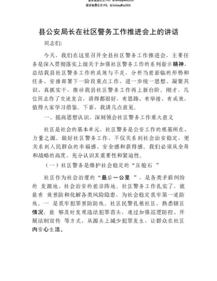 【七哥公文】2025年:【七哥公文】县公安局长在社区警务工作推进会上的讲话+更多免费公文+VX:QiGeGongWen2024+更多免费公文+VX:QiGeGongWen2024