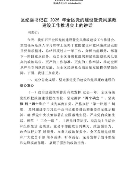 【七哥公文】2025年:【七哥公文】区纪委书记在2025年全区X的建设暨X风廉政建设工作推进会上的讲话+更多免费公文+VX:QiGeGongWen2024+更多免费公文+VX:QiGeGongWen2024
