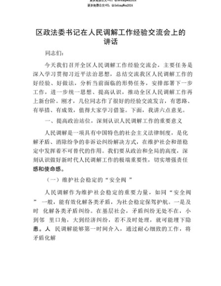 【七哥公文】2025年:【七哥公文】区政法委书记在人民调解工作经验交流会上的讲话+更多免费公文+VX:QiGeGongWen2024+更多免费公文+VX:QiGeGongWen2024