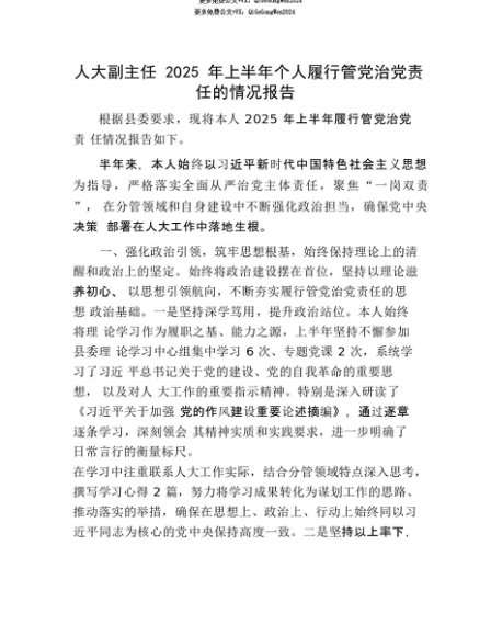 【七哥公文】2025年:【七哥公文】人大副主任2025年上半年个人履行管X治X责任的情况报告+更多免费公文+VX:QiGeGongWen2024+更多免费公文+VX:QiGeGongWen2024