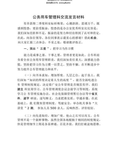 【七哥公文】2025年:【七哥公文】公务用车管理科交流发言材料+更多免费公文+VX:QiGeGongWen2024+更多免费公文+VX:QiGeGongWen2024