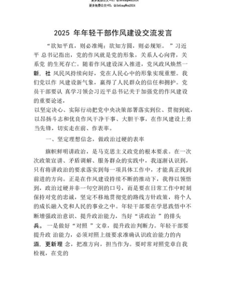 【七哥公文】2025年:【七哥公文】2025年年轻干部作风建设交流发言+更多免费公文+VX:QiGeGongWen2024+更多免费公文+VX:QiGeGongWen2024