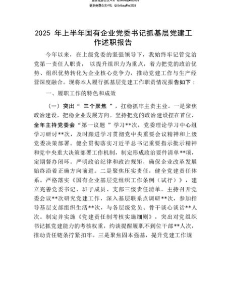 【七哥公文】2025年:【七哥公文】2025年上半年国有企业X委书记抓基层X建工作述职报告+更多免费公文+VX:QiGeGongWen2024+更多免费公文+VX:QiGeGongWen2024