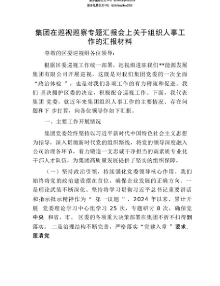 【七哥公文】2025年:【七哥公文】集团在巡视巡察专题汇报会上关于组织人事工作的汇报材料+更多免费公文+VX:QiGeGongWen2024+更多免费公文+VX:QiGeGongWen2024