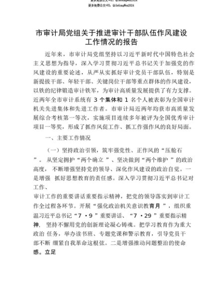 【七哥公文】2025年:【七哥公文】市审计局X组关于推进审计干部队伍作风建设工作情况的报告+更多免费公文+VX:QiGeGongWen2024+更多免费公文+VX:QiGeGongWen2024