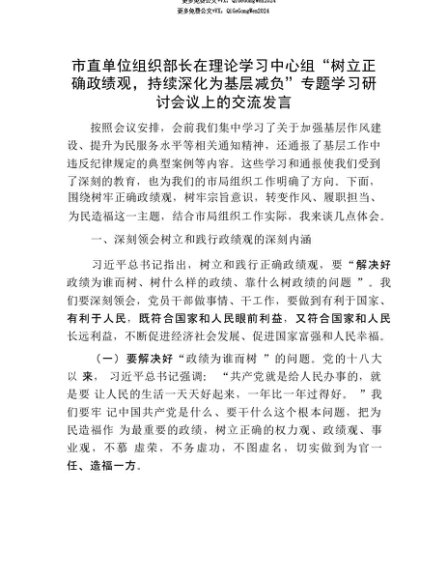 【七哥公文】2025年:【七哥公文】市直单位组织部长在理论学习中心组“树立正确政绩观,持续深化为基层减负”专题学习研讨会议上的交流发言+更多免费公文+VX:QiGeGongWen2024+更多免费公文+VX:QiGeGongWen2024