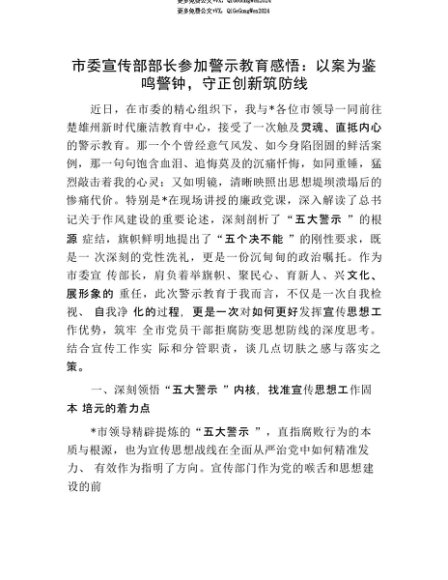 【七哥公文】2025年:【七哥公文】市委宣传部部长参加警示教育感悟:以案为鉴鸣警钟,守正创新筑防线+更多免费公文+VX:QiGeGongWen2024+更多免费公文+VX:QiGeGongWen2024